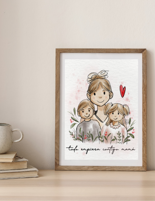 La ilustración se imprime en tamaño 15 × 20 cm sobre papel de alta calidad de 250g e incluye marco en medida 23 × 28 cm, listo para regalar.